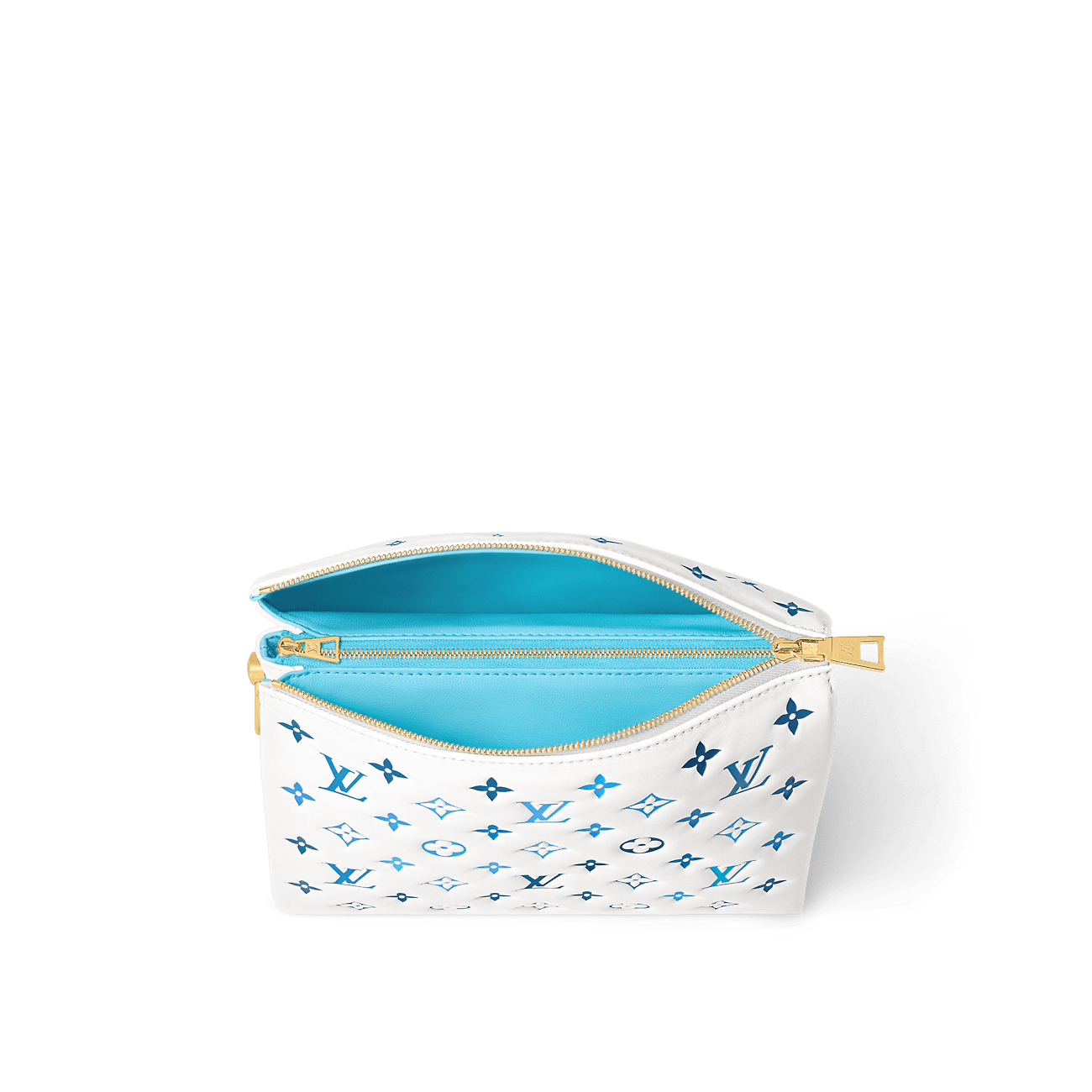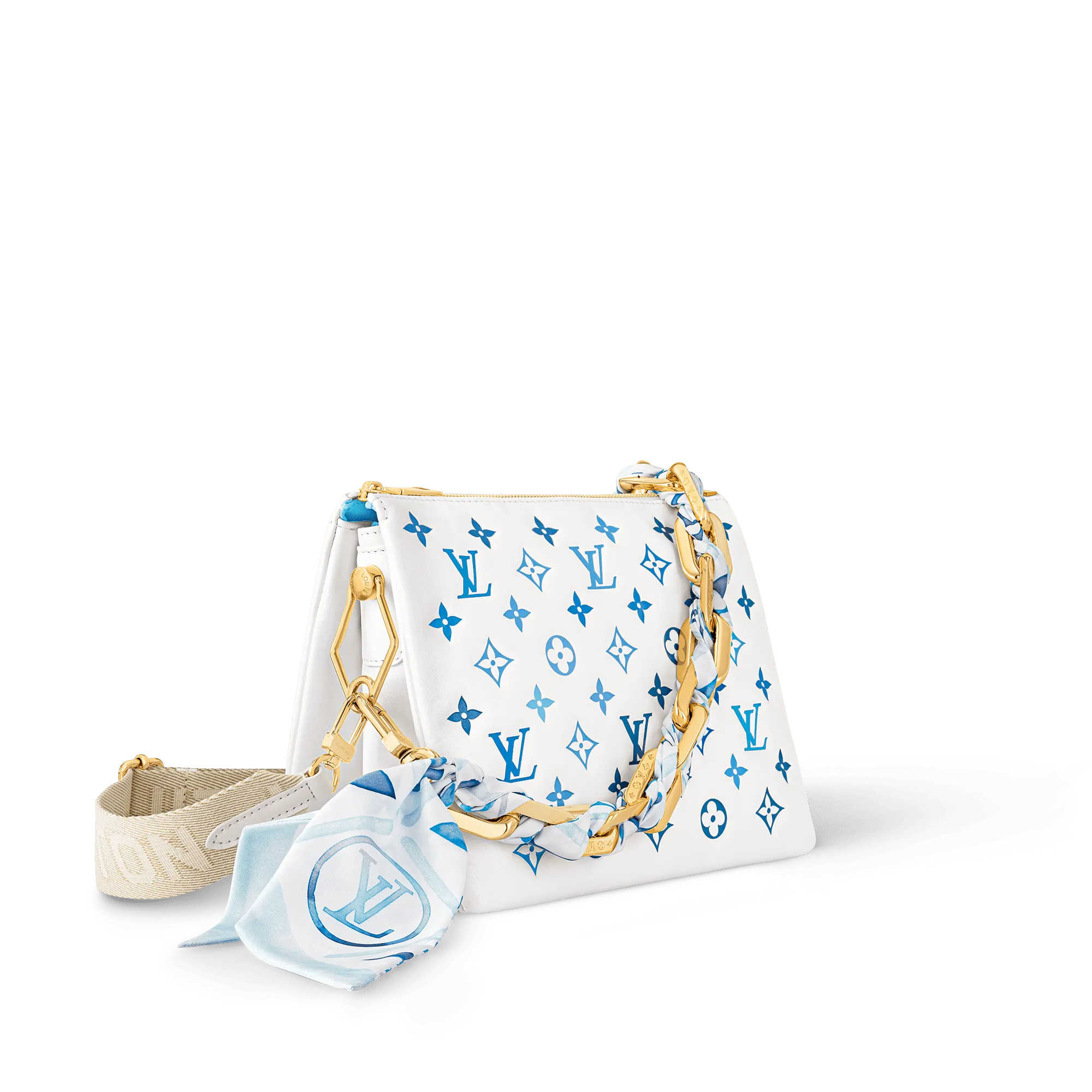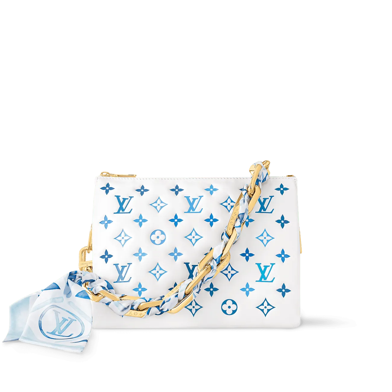 Get 45% off the Louis Vuitton M11225 Coussin PM from clutchestrends outlet (code: EXTRA45) with free worldwide shipping. As part of the LV By The Pool Collection the Coussin PM is made from puffy lambskin with Monogram embossing and a watercolor-style Monogram print. The braided chain plays with the same colorway. It also has a two-sided wide removable and adjustable strap. The interior is composed of two compartments separated by a zipped pocket. Louis Vuitton M11225 Coussin PM details: