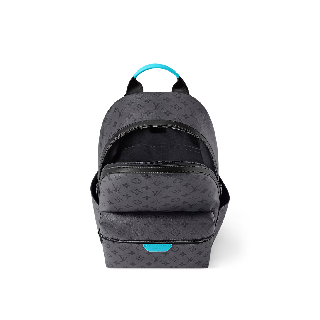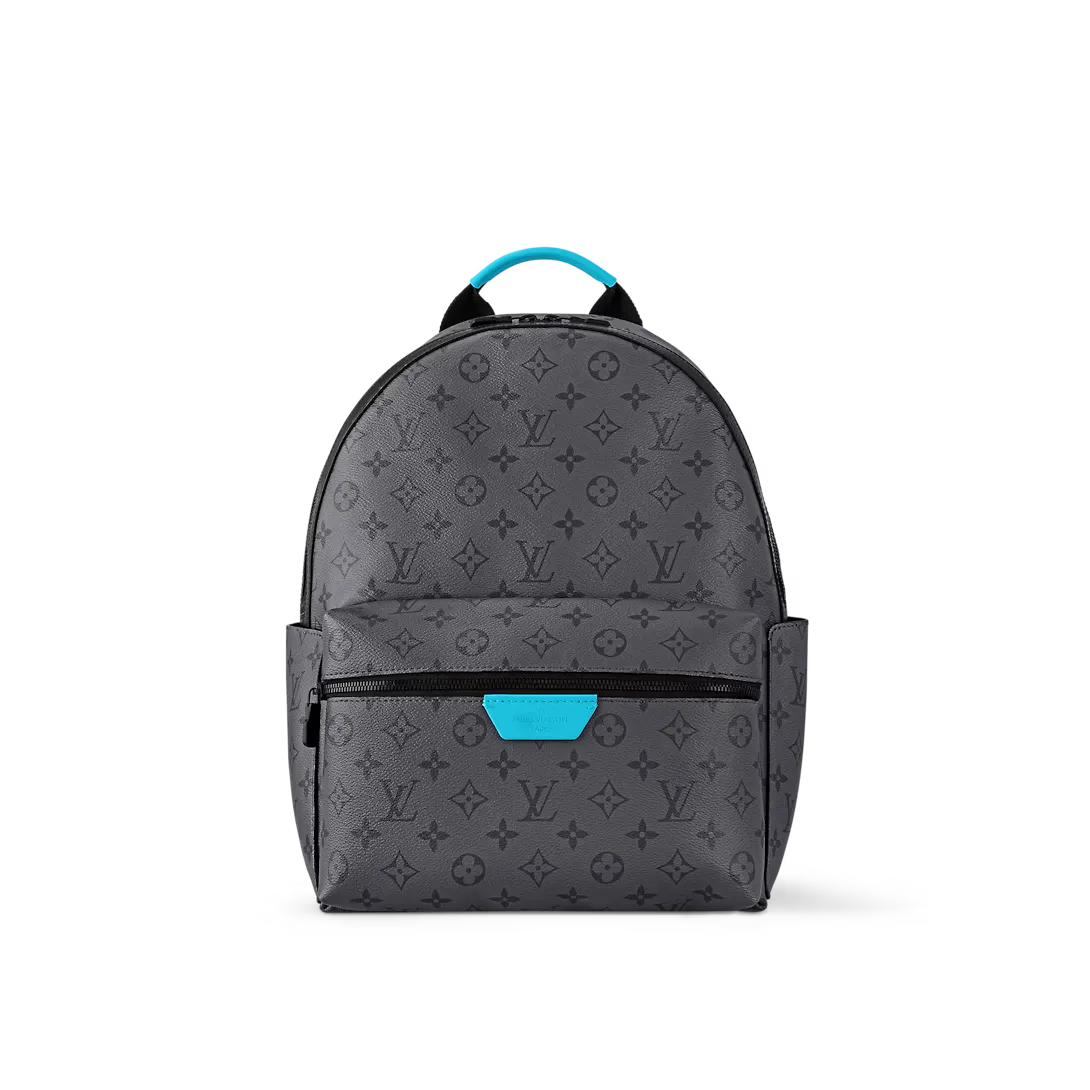 The Discovery Backpack PM is made from Monogram Eclipse Reverse canvas with its black-and-gray Monogram. The motif is livened up with turquoise on the leather label on the front pocket around the zipper and on the top handle. Its zipped front pocket and two open side pockets make this is a great everyday bag.