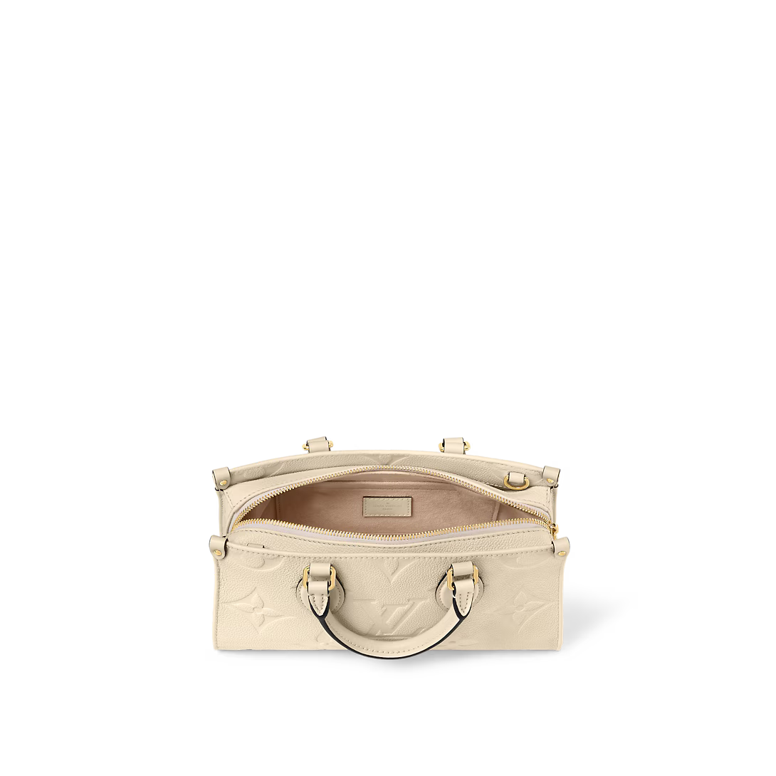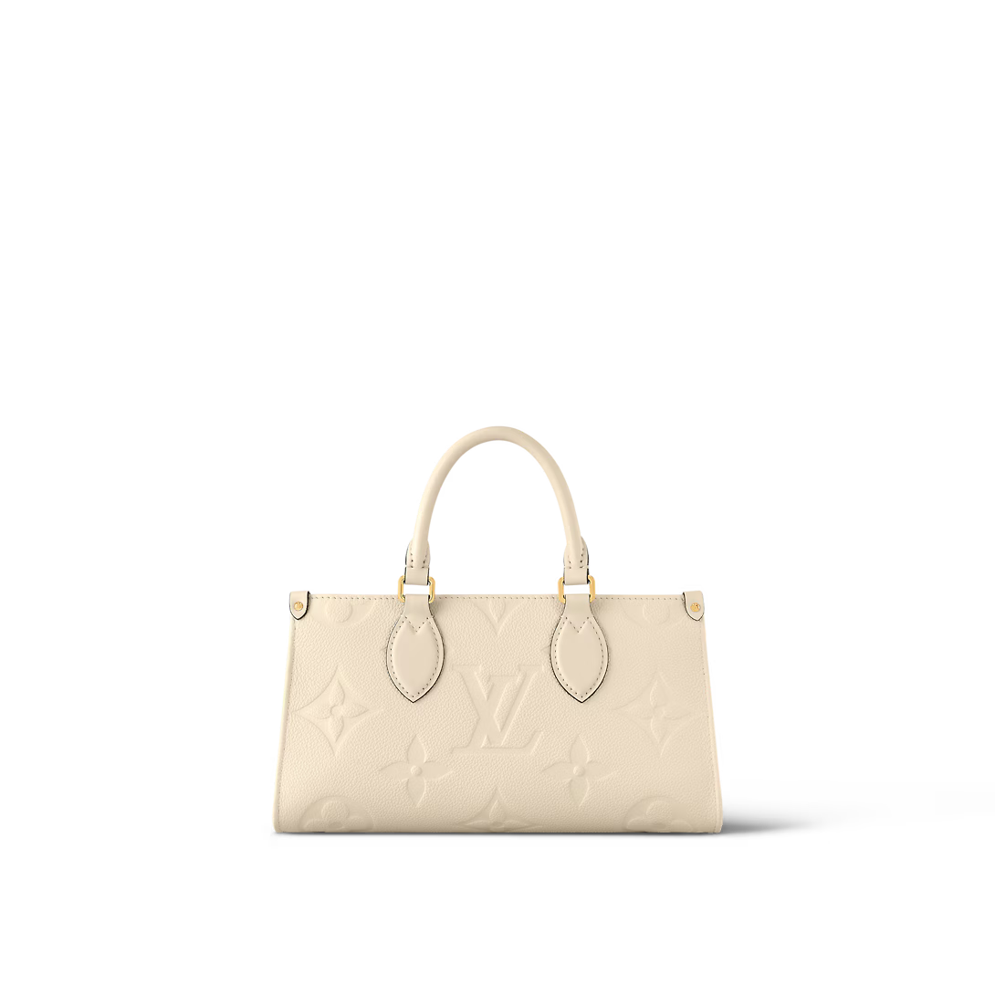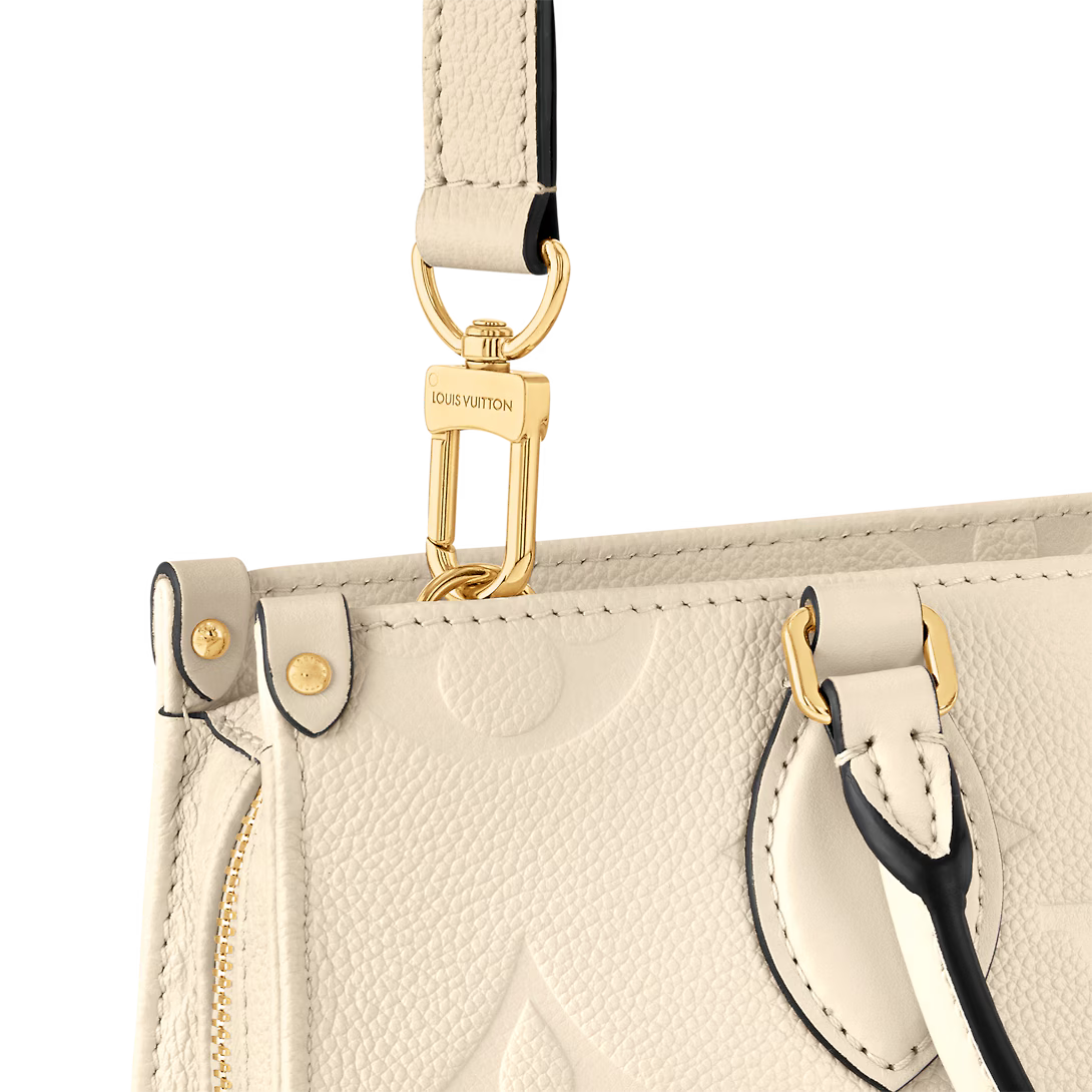 Introducing the OnTheGo East West tote interpreted in a beautifully proportioned east-west silhouette. Made from Monogram Empreinte leather embossed with a tonal Giant Monogram motif this compact model boasts a well-organized interior for daily essentials. The bag lends itself to a variety of carry styles thanks to its two articulated top handles and a removable chain-and-leather strap.