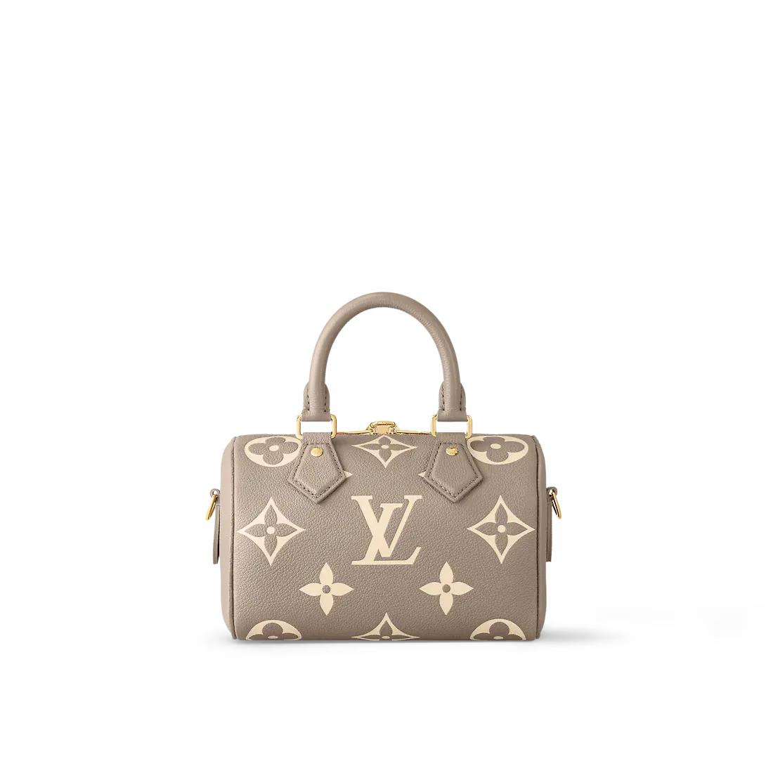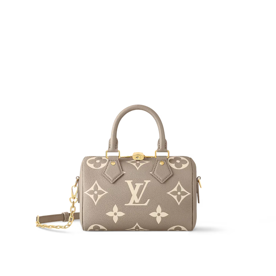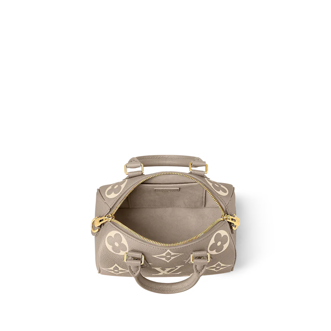 Made from two-tone Monogram Empreinte leather with the LVs and Monogram Flowers in a cream colour the Speedy Bandoulière 20 bag is a modern classic. Inspired by the House’s Speedy luggage line introduced in the 1930s it features the same shape and articulated top handles. A chain-and-leather strap enable shoulder and cross-body wear.
