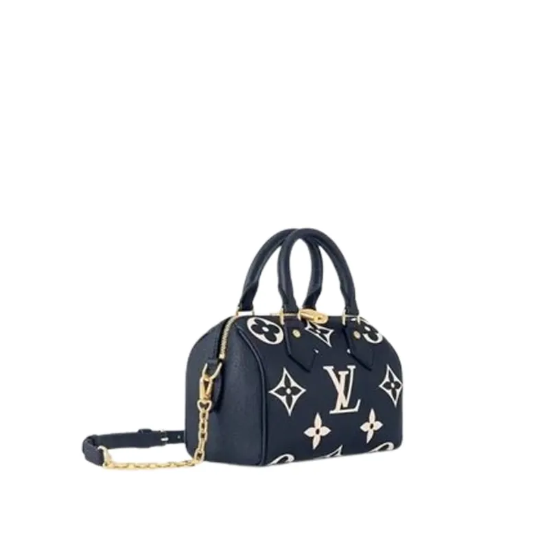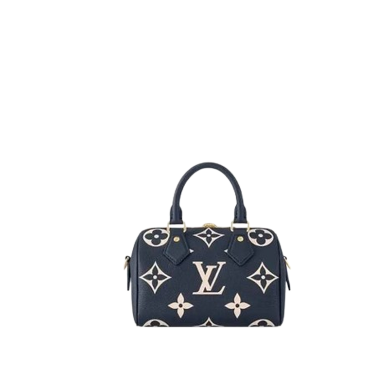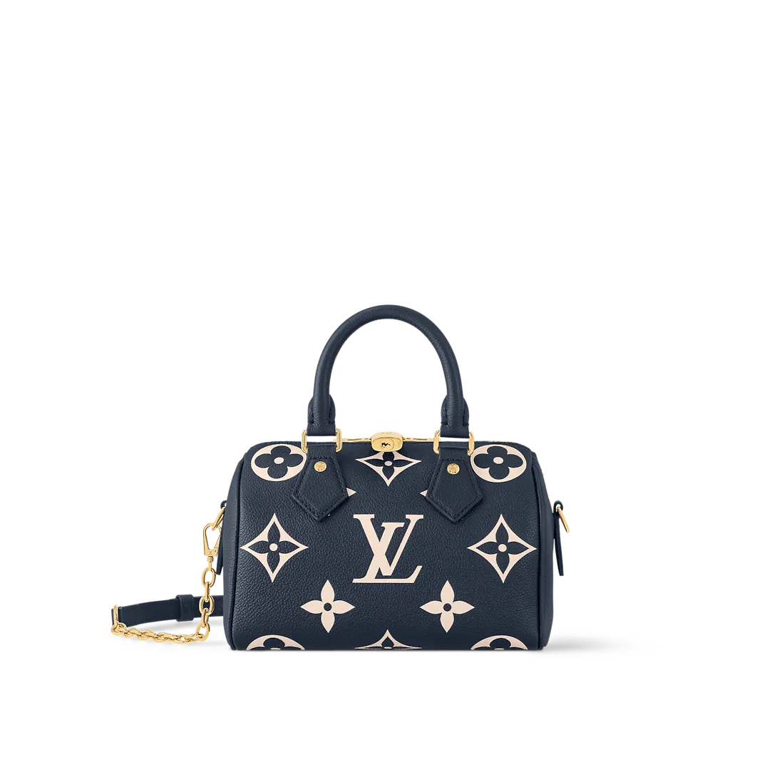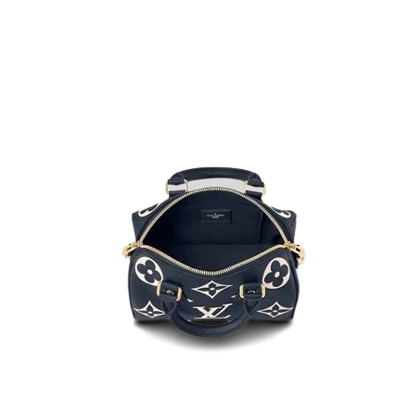 Two-color Monogram Empreinte cowhide leather brings a luxurious aspect to the Speedy Bandoulière 20. The Monogram is first embossed into the navy-blue leather then the pattern is printed in cream on top of the embossing. Part of the Nautical Collection the Speedy features two top handles and a removable and adjustable strap for shoulder carry.