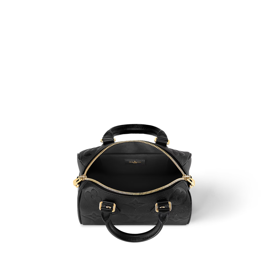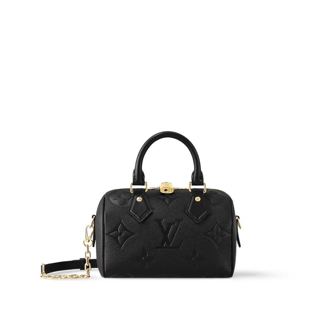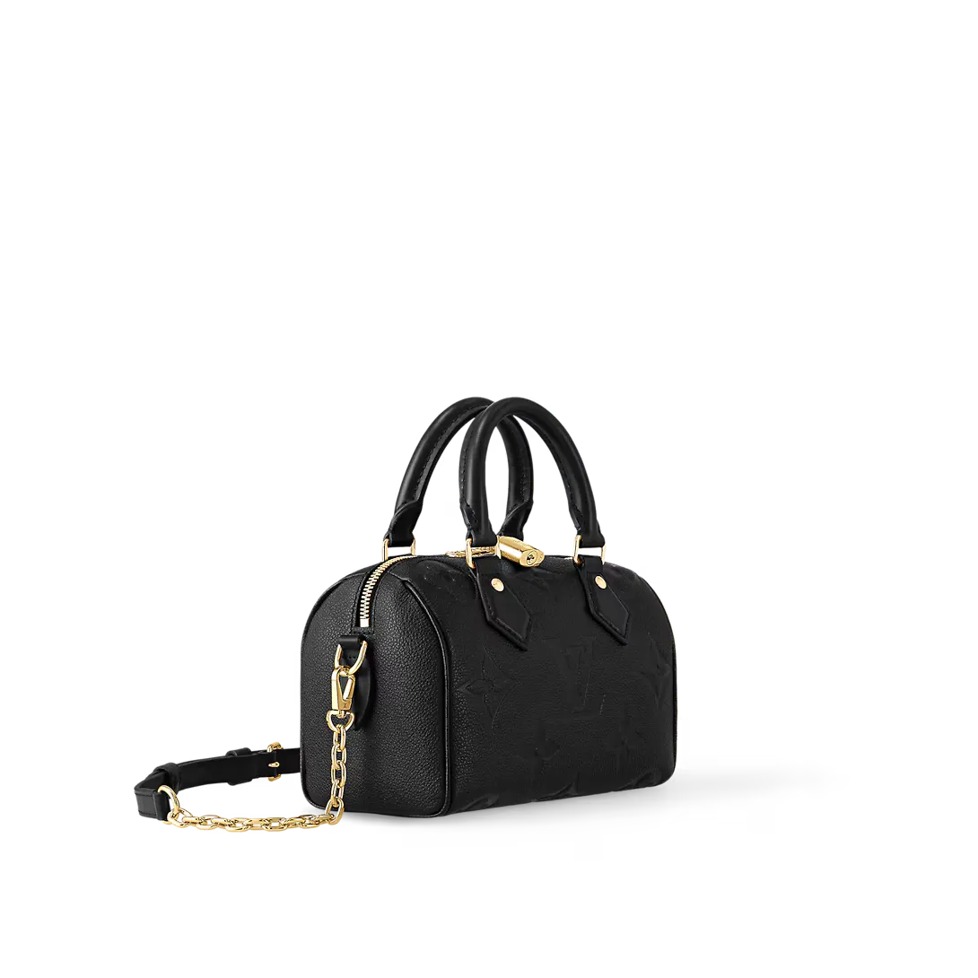 The Speedy Bandoulière 20 bag is an on-trend compact bag just the right size to carry daily essentials. It’s made from smooth grained Monogram Empreinte leather embossed with an oversized Monogram pattern. The hardware and padlock are a golden colour. It has a delicate chain strap that is removable and adjustable in addition to two Toron handles. Louis Vuitton M58953 Speedy Bandoulière 20 details: