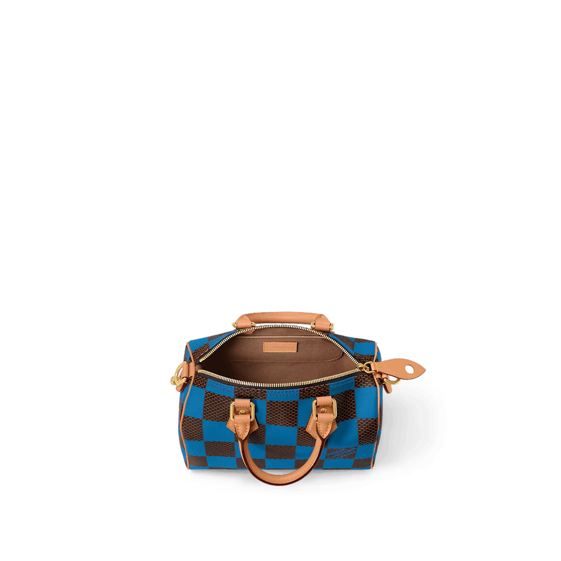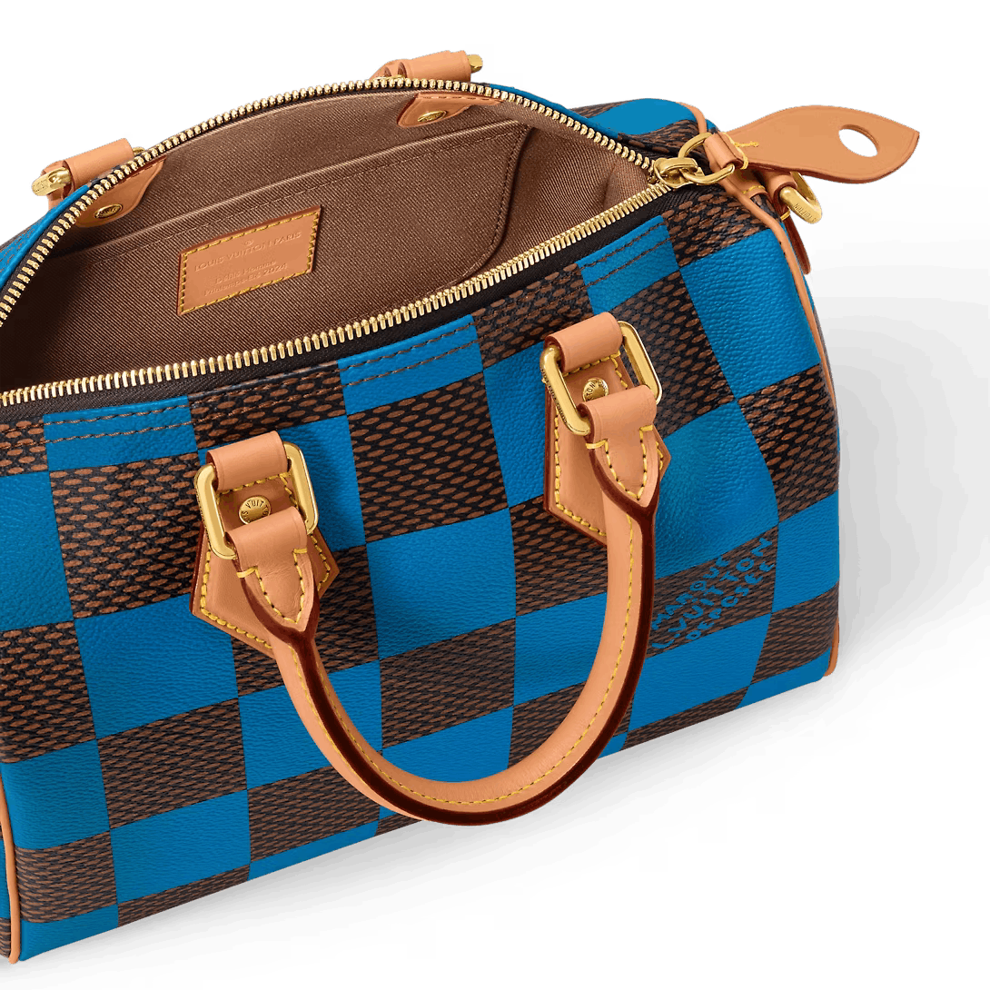 This Speedy 25 Bandoulière Damier Pop displays the same trapezoid lines as the classic Speedy but made from supple Damier Pop coated canvas the bottom of the bag drapes casually. The new colorway brings a touch of playfulness while the natural cowhide-leather trim and polished gold-color hardware pay homage to the House’s classic bags.