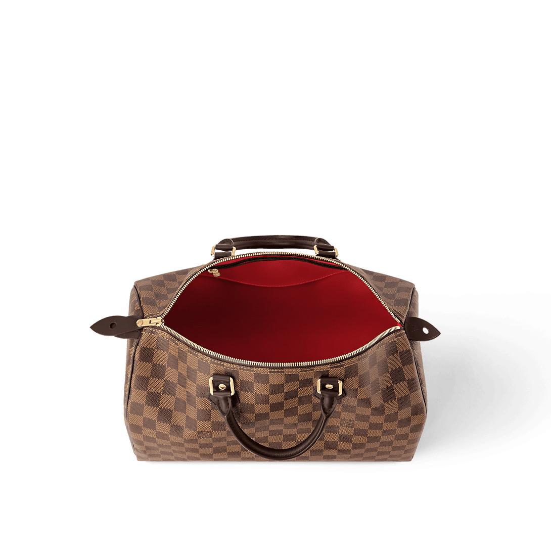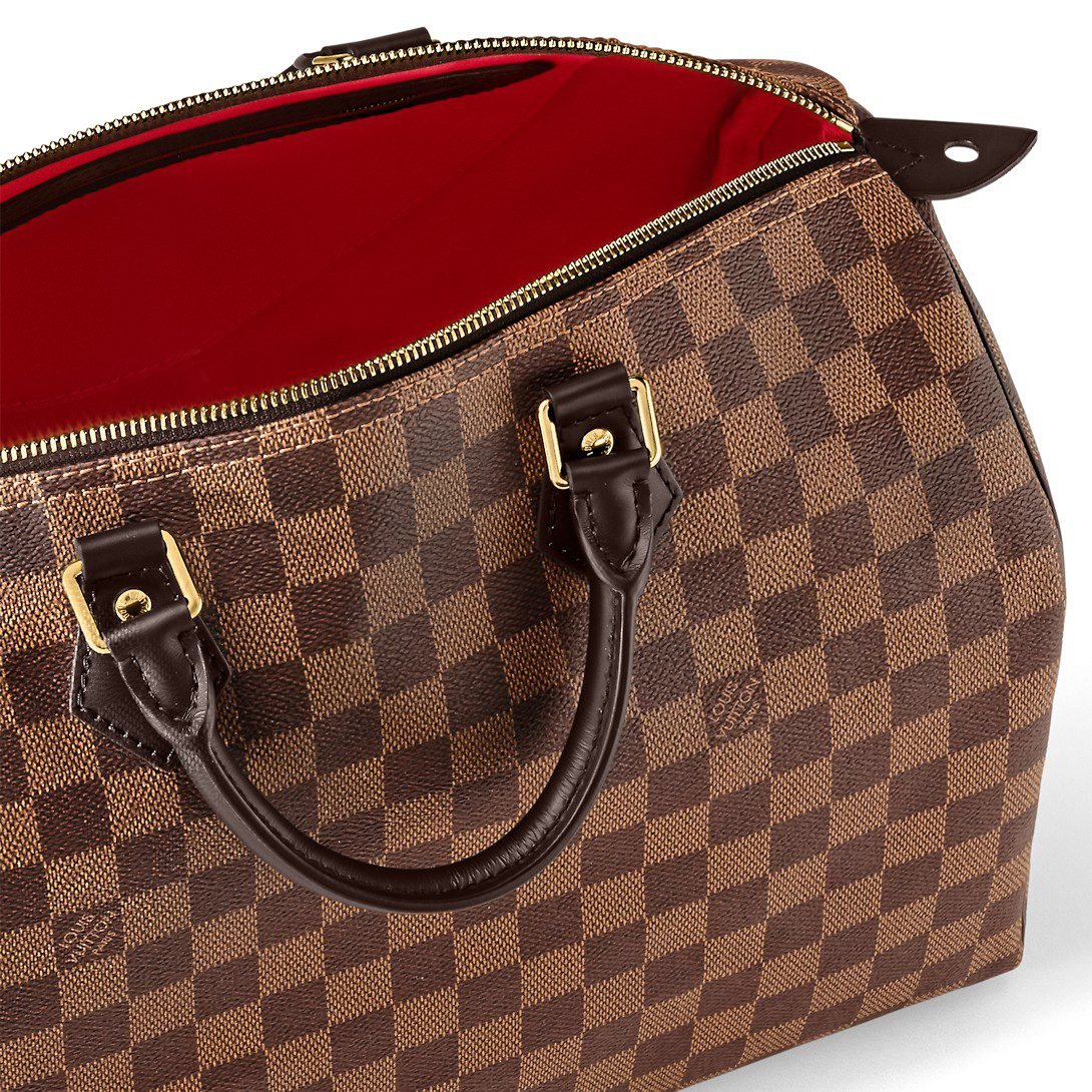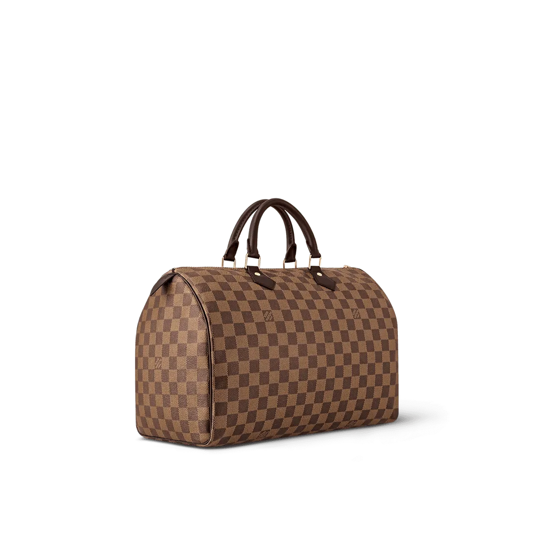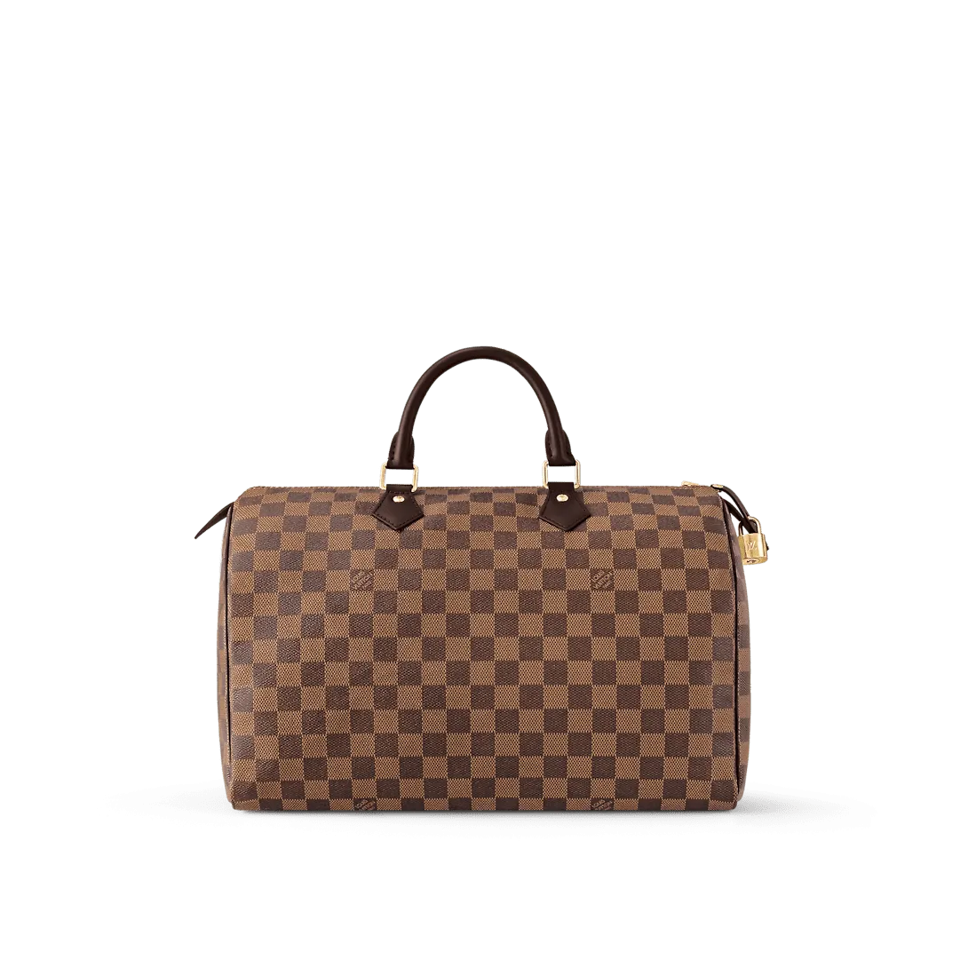 Made from elegant Damier Ebene canvas the Speedy 35 is a stylish handbag for both travel and daily use. Launched in 1930 as the “Express” and inspired by that era’s rapid transit today’s updated Speedy remains a timeless House icon with its unmistakable silhouette rolled leather handles and engraved signature padlock.