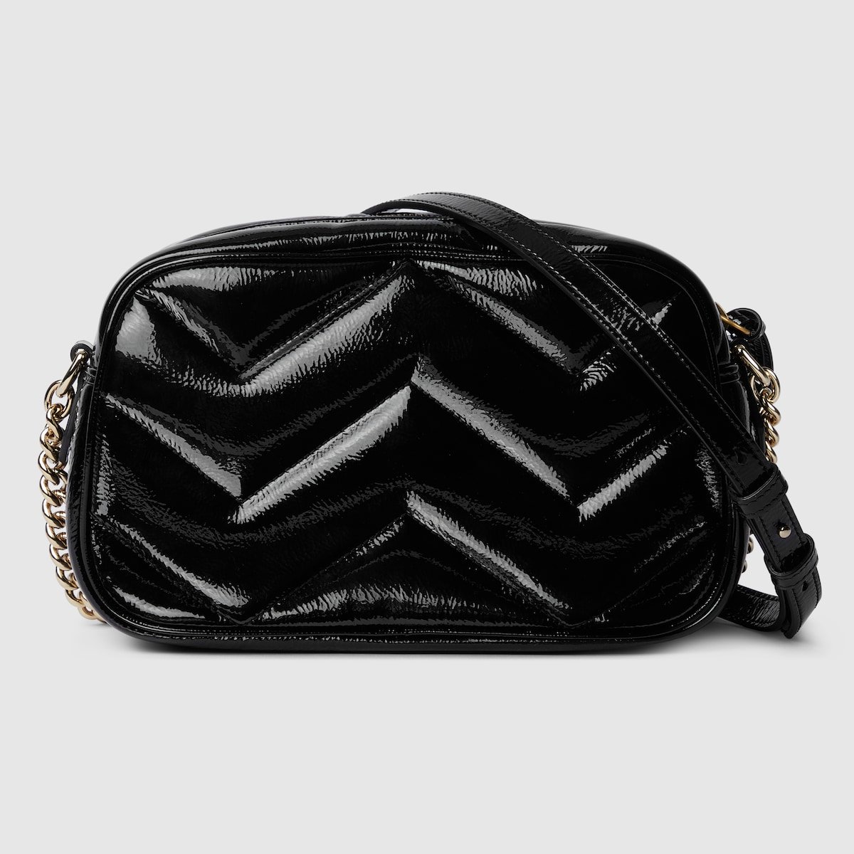 The GG Marmont collection spotlights sophisticated leather in dark tones to welcome Pre-Fall. Crafted in quilted chevron patent leather, this small shoulder bag with a zip closure underlines its contemporary silhouette in black, complete with light gold toned hardware.