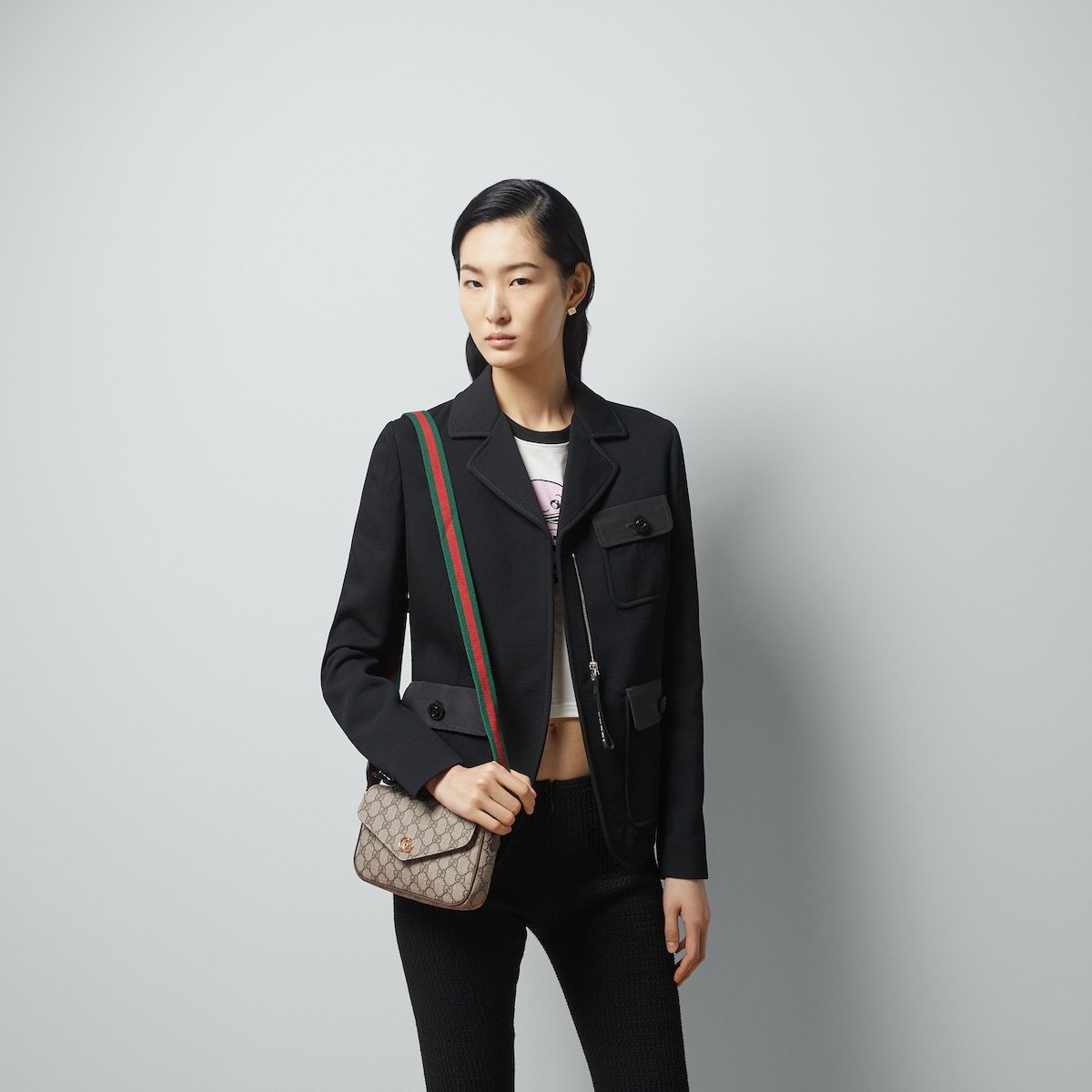 The world of Ophidia continues to evolve, incorporating new shapes and materials each season. Crafted from beige and ebony GG Supreme canvas, this mini bag is further enriched by the Double G hardware and a Web shoulder strap.