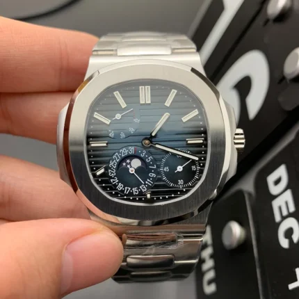 Patek Philippe Nautilus Watches. 43mm x 38mm stainless steel case, sapphire crystal back, screw-down crown, black-blue dial with gold applied