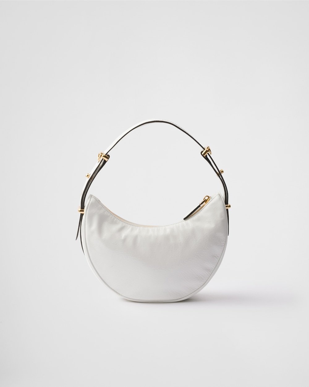 The soft, sinuous lines of the Prada Arqué bag are emphasized by the naplak patent leather that gives the accessory a distinctive shiny effect and texture with vintage allure. Elegant gold-tone hardware embellishes the silhouette.