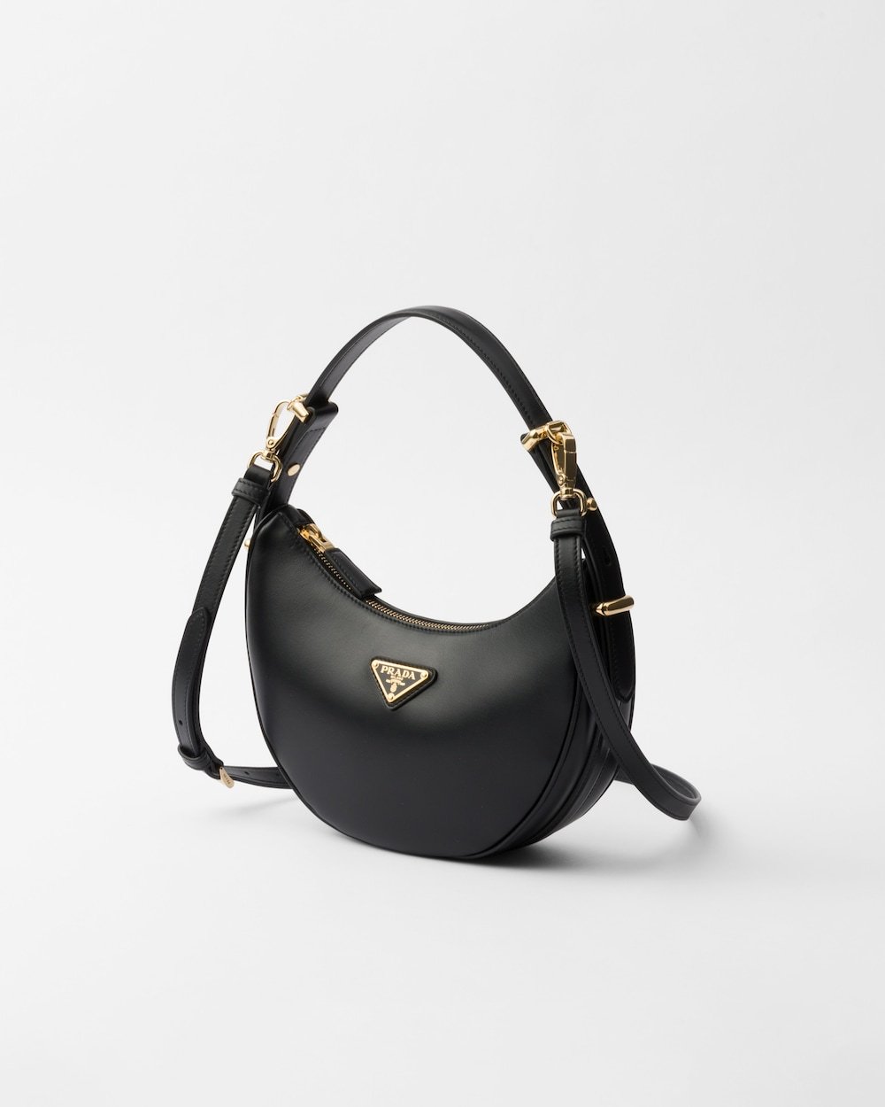 This sleek leather bag has a versatile, modernist allure. The accessory with a sinuous silhouette is completed by the leather extension and detachable shoulder strap for wearing different ways. The bag with nappa leather interior and metal hardware is embellished with the enameled metal triangle logo on the front.
