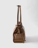 This pragmatic and refined handbag is made of soft leather with a glossy finish that emphasizes its versatile, modern allure. The geometric design blends different influences into one style with a distinctive but sleek aesthetic. Embellished by the sophisticated strap detail, the rectangular silhouette has a roomy interior with zipper pockets. The enameled metal triangle logo completes the look with its iconic signature.