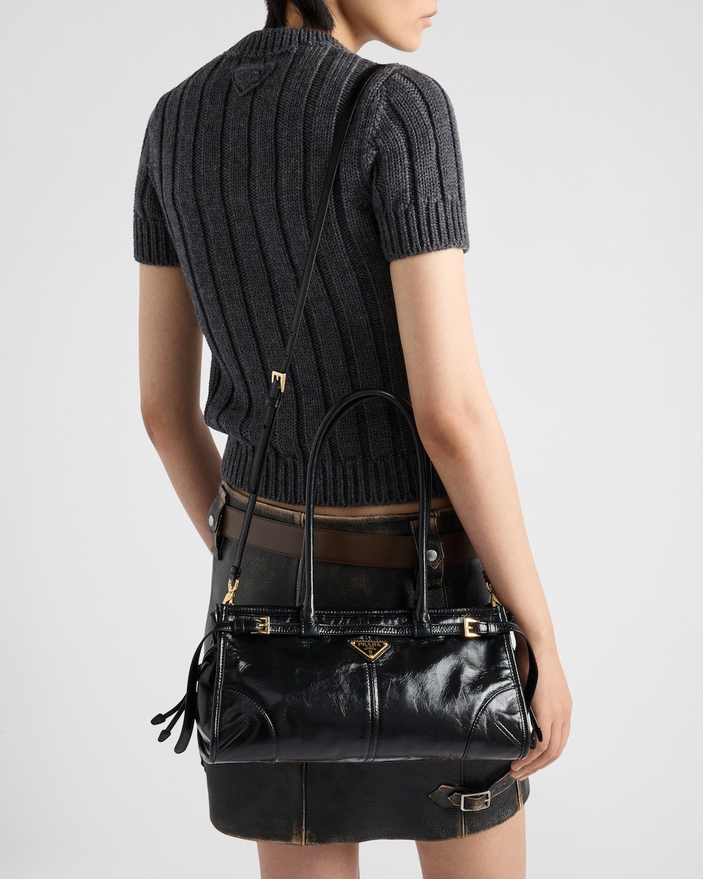 This pragmatic and refined handbag is made of soft leather with a glossy finish that emphasizes its versatile, modern allure. The geometric design blends different influences into one style with a distinctive but sleek aesthetic. Embellished by the sophisticated strap detail, the rectangular silhouette has zipper pockets inside. The enameled metal triangle logo completes the look with its iconic signature.