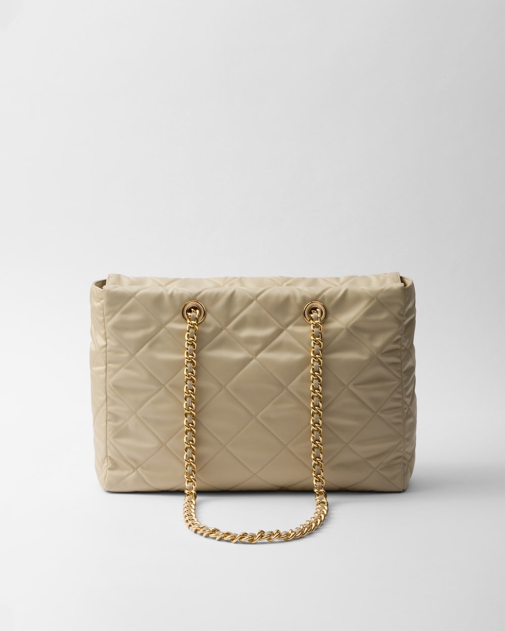 A re-edition of an iconic style of 1995, this shoulder bag summarizes Prada codes in a casual, versatile silhouette that establishes a dialog between stylistic languages of past and present. The design with soft volumes is made of Re-Nylon, the innovative regenerated nylon yarn, defined by iconic stitching that reveals a geometric pattern. The leather and metal chain handles complete the accessory with vintage charm, decorated with the enameled metal triangle logo.