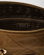 A re-edition of an iconic style of 1995, this shoulder bag summarizes Prada codes in a casual, versatile silhouette that establishes a dialog between stylistic languages of past and present. The design with soft volumes is made of Re-Nylon, the innovative regenerated nylon yarn, defined by iconic stitching that reveals a geometric pattern. The leather and metal chain handles complete the accessory with vintage charm, decorated with the enameled metal triangle logo.