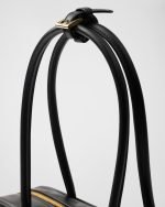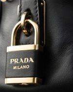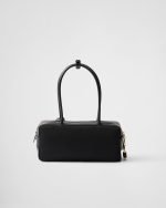 This structured top-handle bag, crafted from Re-Nylon and leather, presents a compact silhouette with sophisticated charm. The metal hardware and the enameled metal triangle logo adorn the style, while the zipper and padlock closure add a unique accent.