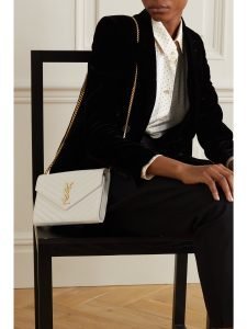 SAINT LAURENT’s wallet has a slim silhouette and a pointed front flap just like an envelope. Intended to stash the smallest essentials it’s made from textured-leather and fitted with six card slots and a slip pocket. Detach the chain strap to hold it as a clutch.