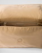 The hybrid concept pervades the Prada narrative and is translated into innovative designs with an interesting and unusual combination of materials, shapes, and functions. This flap bag with a sophisticated, feminine silhouette is reinterpreted in a technologically innovative material: Re-Nylon fabric, made of recycled plastic collected in the ocean. The padding gives the accessory a soft, contemporary look, and the adjustable leather shoulder strap allows it to be worn in different ways.