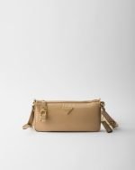 This compact bag with a refined silhouette that embodies the essence of Prada codes is made of Re-Nylon with leather details. The gold-tone metal hardware and the elegant small lock embellishing the closure complete the versatile, modern accessory.