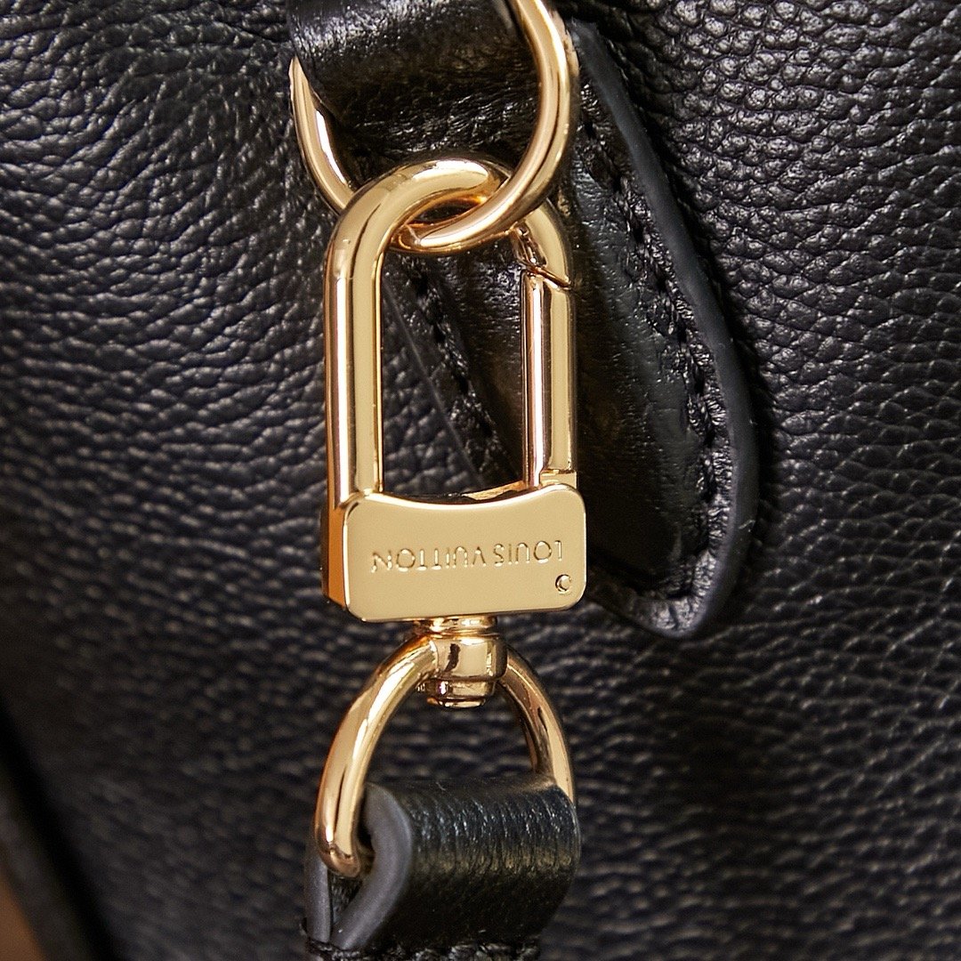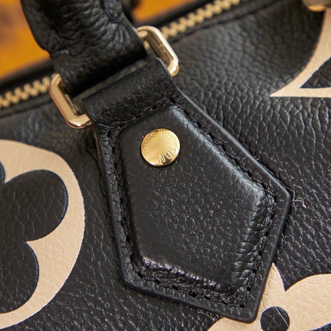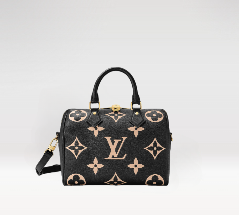 紧凑型 Speedy Bandoulière 25 手提包采用黑色 Monogram Empreinte 皮革制成,饰有米色 Oversized Monogram 压花图案。这款精致的手提包灵感来自该品牌 1930 年的“Express”包。采用金色金属配件,内部衬有红色。除了顶部手柄外,还有可拆卸和可调节的肩带,方便携带。